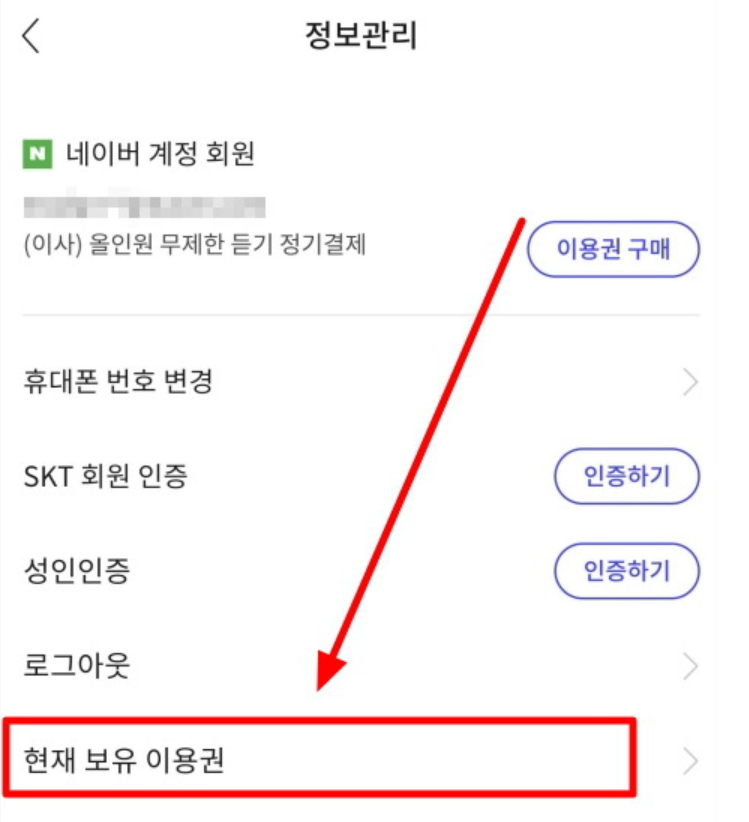정보 관리에 들어 가게 되면 아래의 현재 보유 이용권 목록 을 보실수 있는데 이곳을 클릭 해 주세요