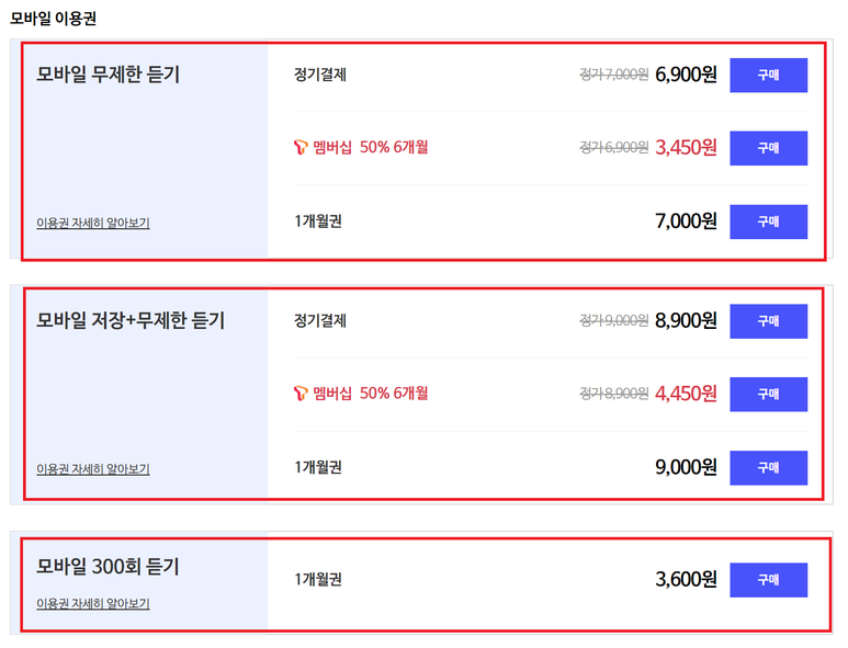모바일 이용권 의 종류는 3가지 로 재생 (1개월 7,000원 / 정기 6,900원) 재 생 및 저장 ( 1개월 9,000원 / 정기 8,900원) 300 회 ( 1개월 3,600원) 로 나뉘어 있습니다. 또한 플로 SKT 는 T멤버 쉽 고객 들에 게 연간 6회 즉