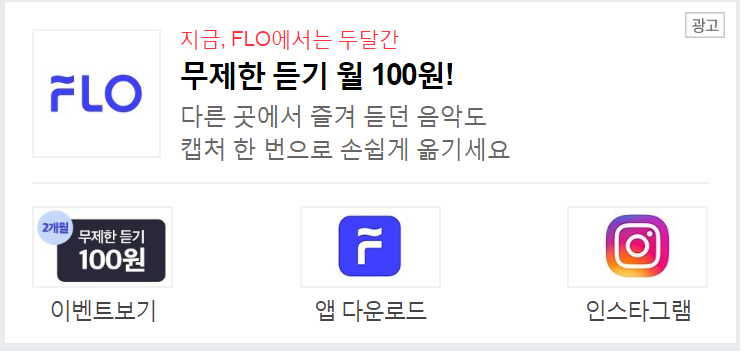 현재 플로 에서는 무제한 듣기 100원 이라는 특별 한 이벤트를 하고 있는 듯 하네요. 그루 버스 에서 운영하며, 사실 우리 가 잘 알고있는 멜론이라는 프로그램 도 SKT에서 서비스 하였 던건 아시나요? 다시 한 번 플로를 통해 서 시장진출 을 하고 있는듯 보입 니다.